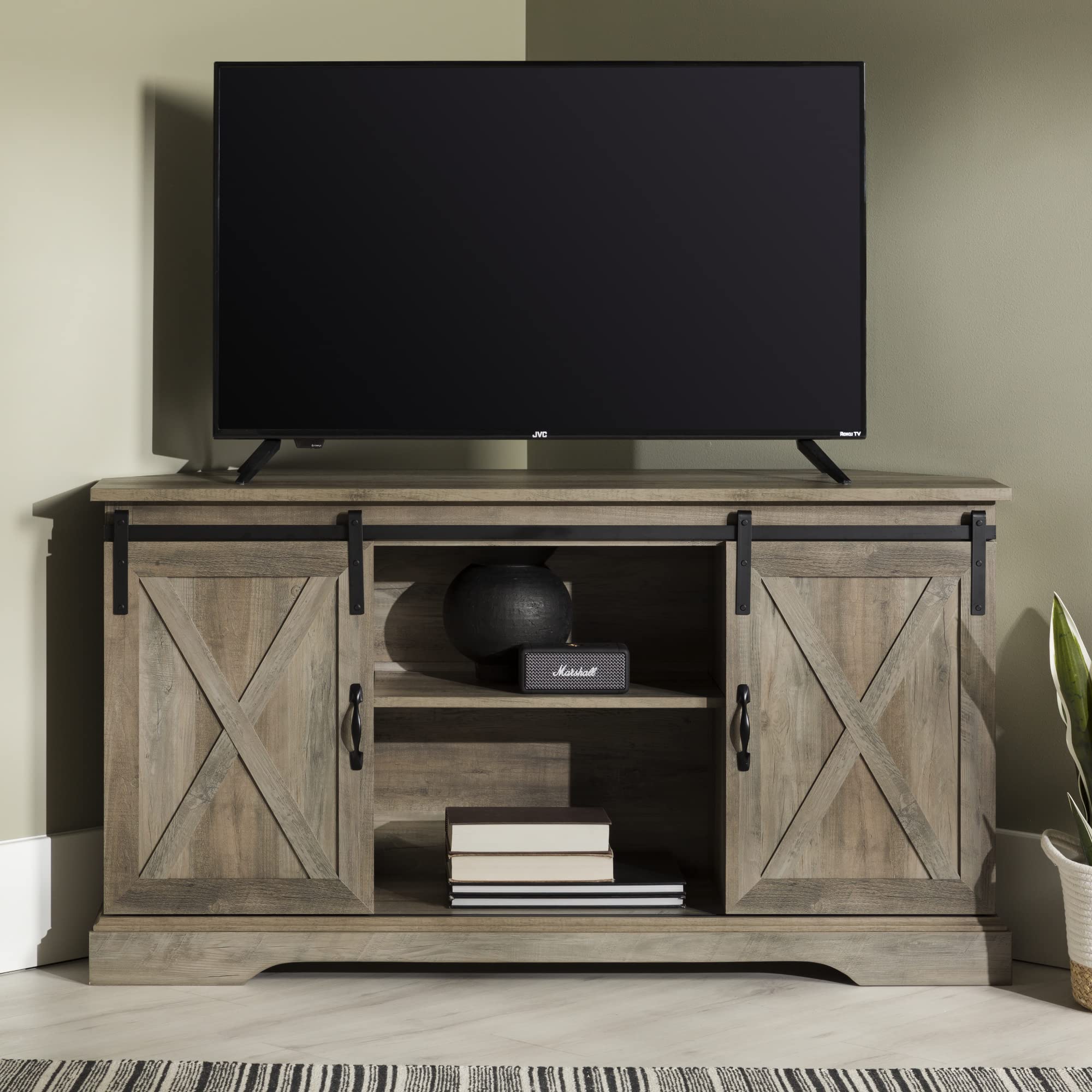Walker Edison Everette Modern Farmhouse Double Sliding X Barn Door TV Stand for TVs up to 58 Inches 52 Inch Grey Wash