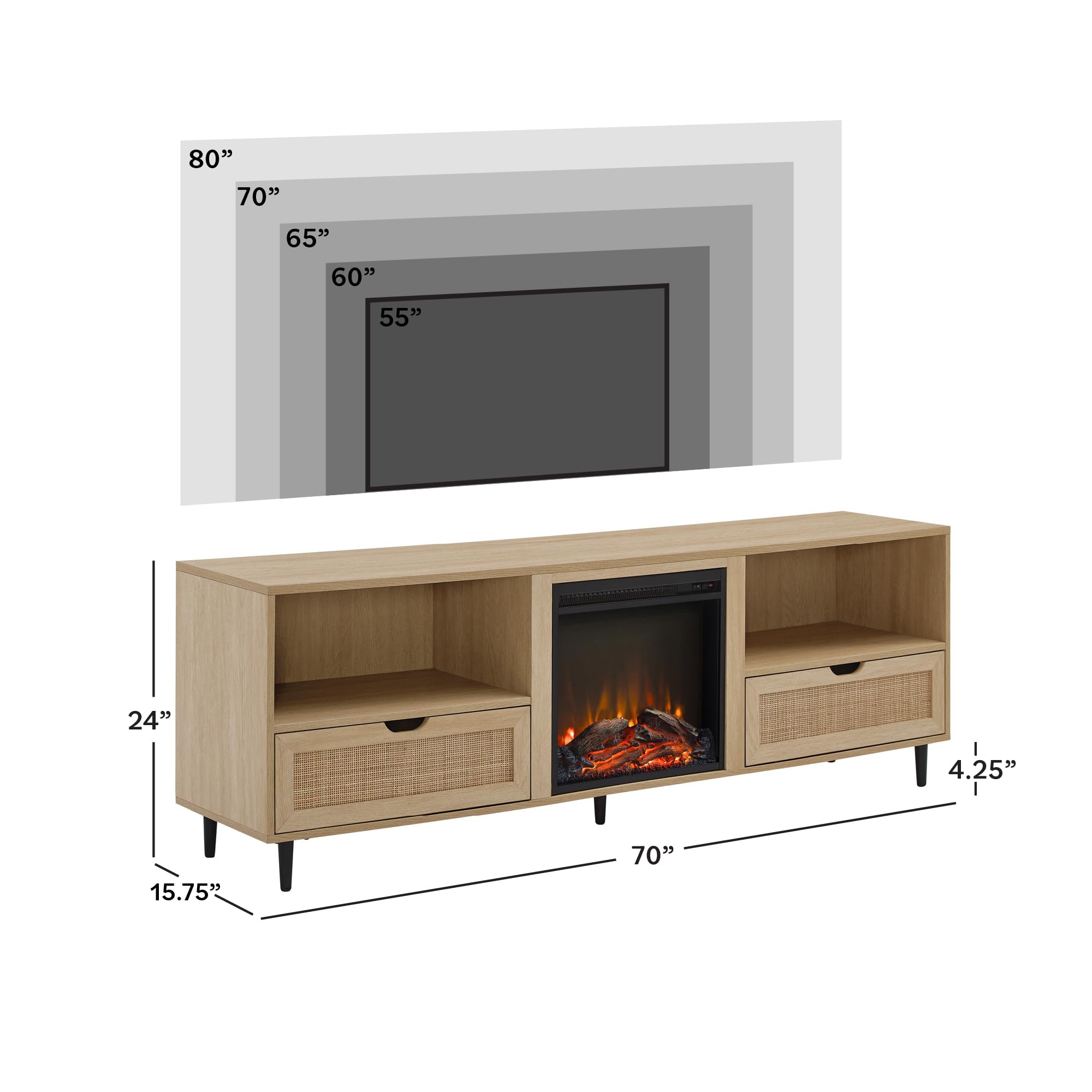 Walker Edison Payton Coastal Rattan-Drawer Fireplace TV Stand for TVs up to 75 Inches 70 Inch Coastal Oak