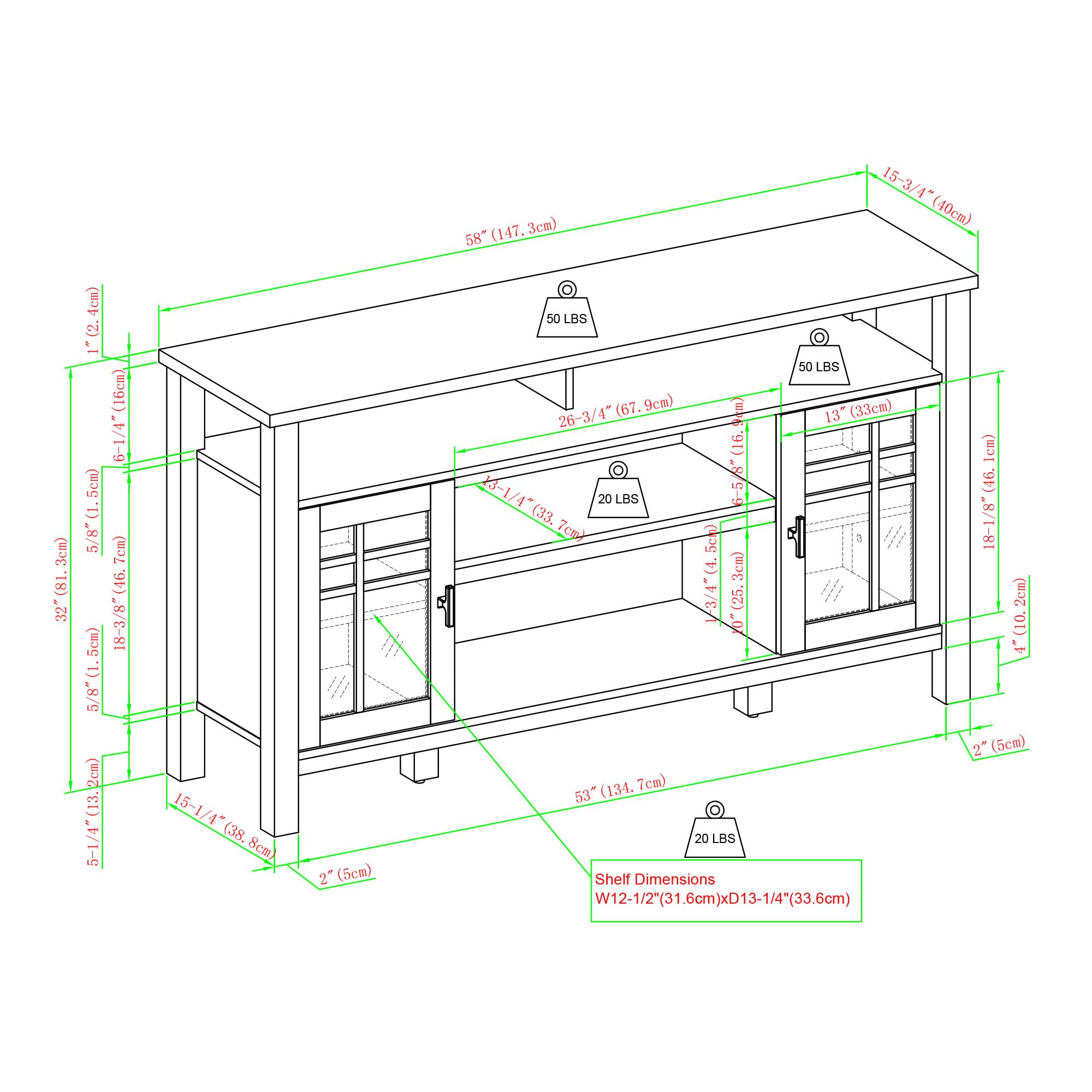 - Assembled dimensions 32” H x 58” L x 15 ¾” W